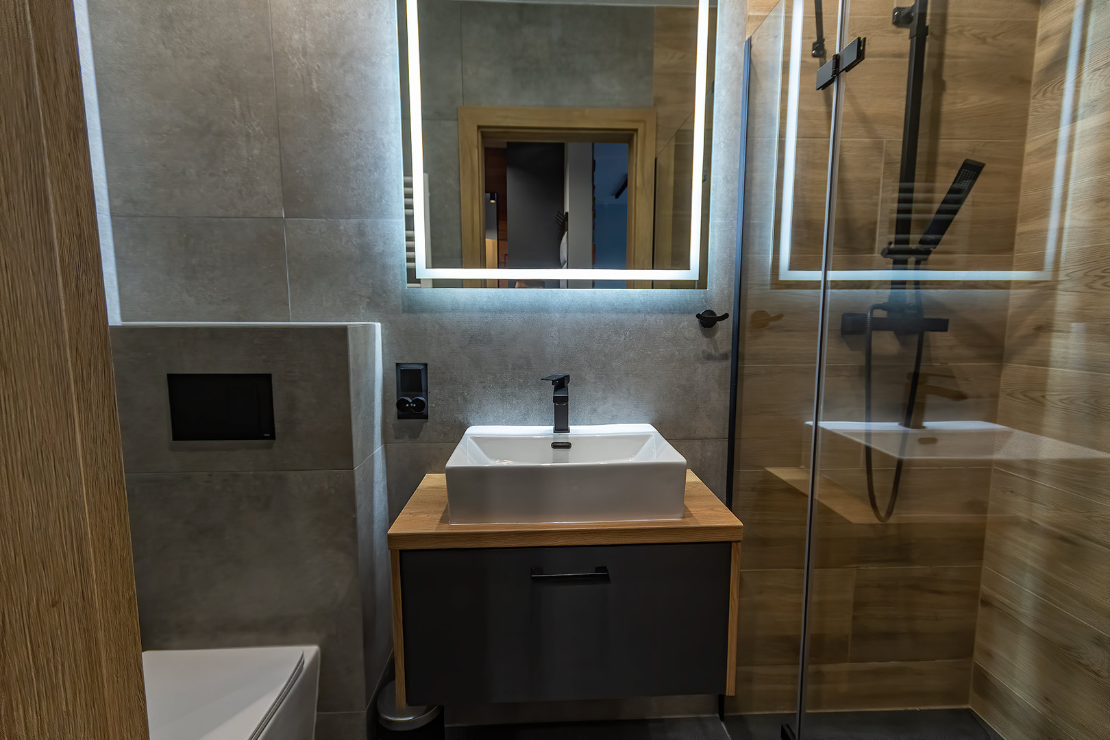 - łazienka z prysznicem oraz suszarką